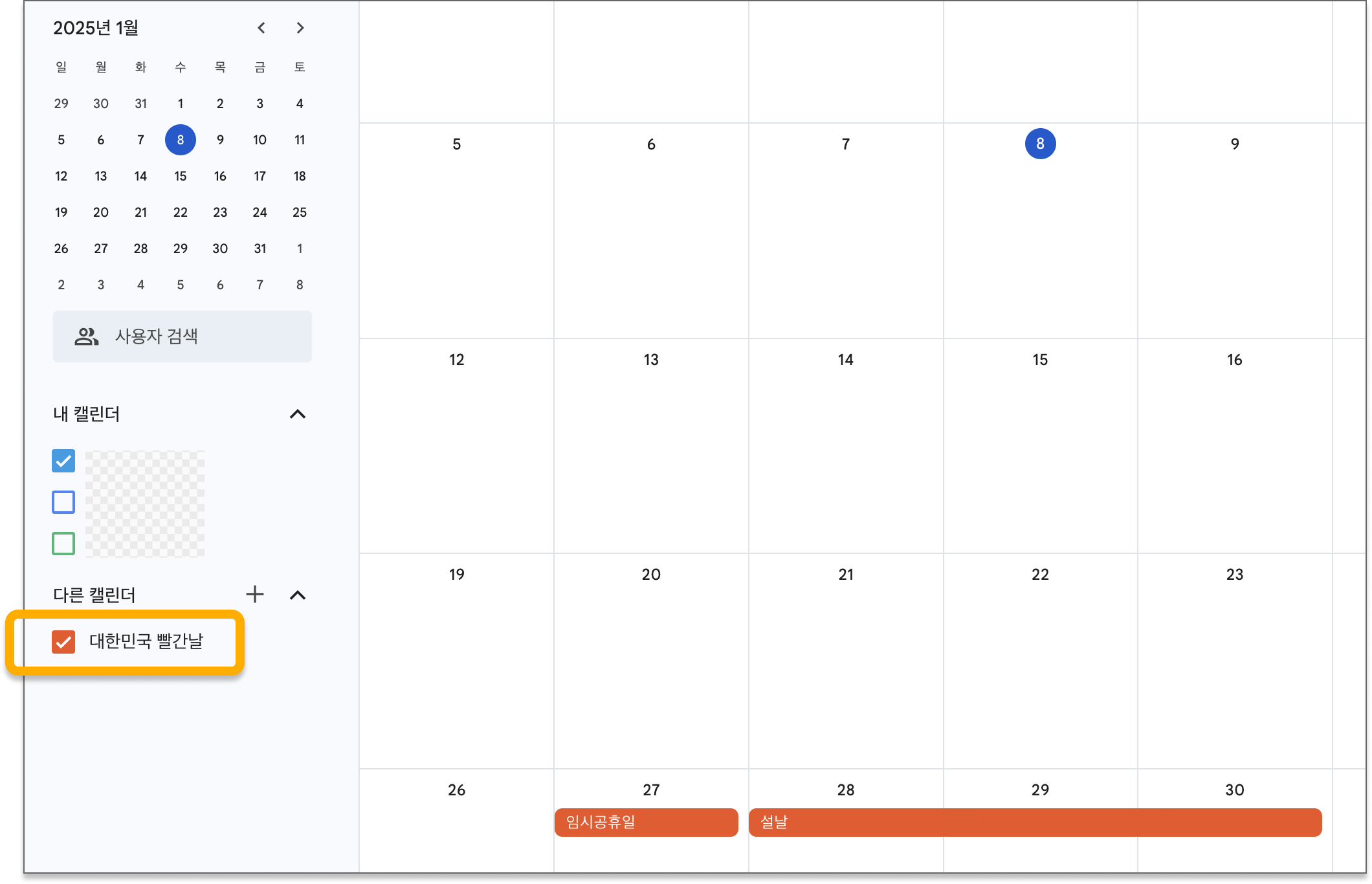 4. 성공! 추가한 달력이 좌측에 뜨는지 확인하세요.