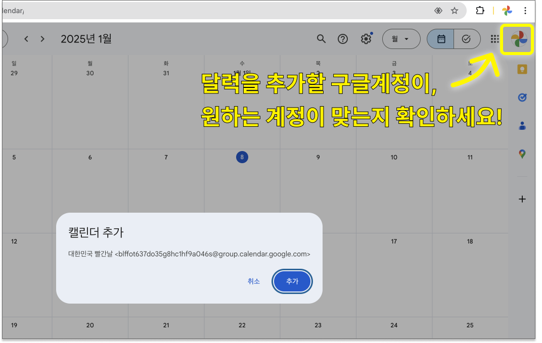 대한민국 빨간날 내 달력에 추가하기 24절기 내 달력에 추가하기 음력(5일마다) 내 달력에 추가하기 음력(10일마다) 내 달력에 추가하기 음력(15일마다) 내 달력에 추가하기 음력(5일마다) + 24절기 내 달력에 추가하기 음력(10일마다) + 24절기 내 달력에 추가하기 음력(15일마다) + 24절기 내 달력에 추가하기 3. 추가 확인 팝업이 뜨면, 다시 한번, 원하는 구글 계정이 맞는지 확인 후, "추가" 버튼을 누르세요.